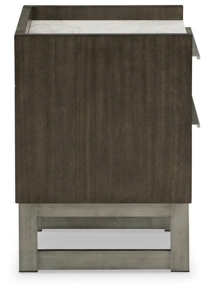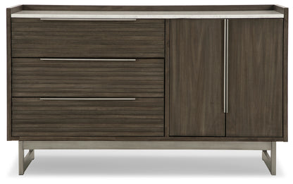 Clean lines lend sophistication and structure to this dresser. Its complex rich grayish brown finish contrasts perfectly with a white marble top, while the streamlined silhouette features overlay slats to create visual interest. A metal base and bar pulls in a low-sheen steel finish add to this piece's contemporary vibe.