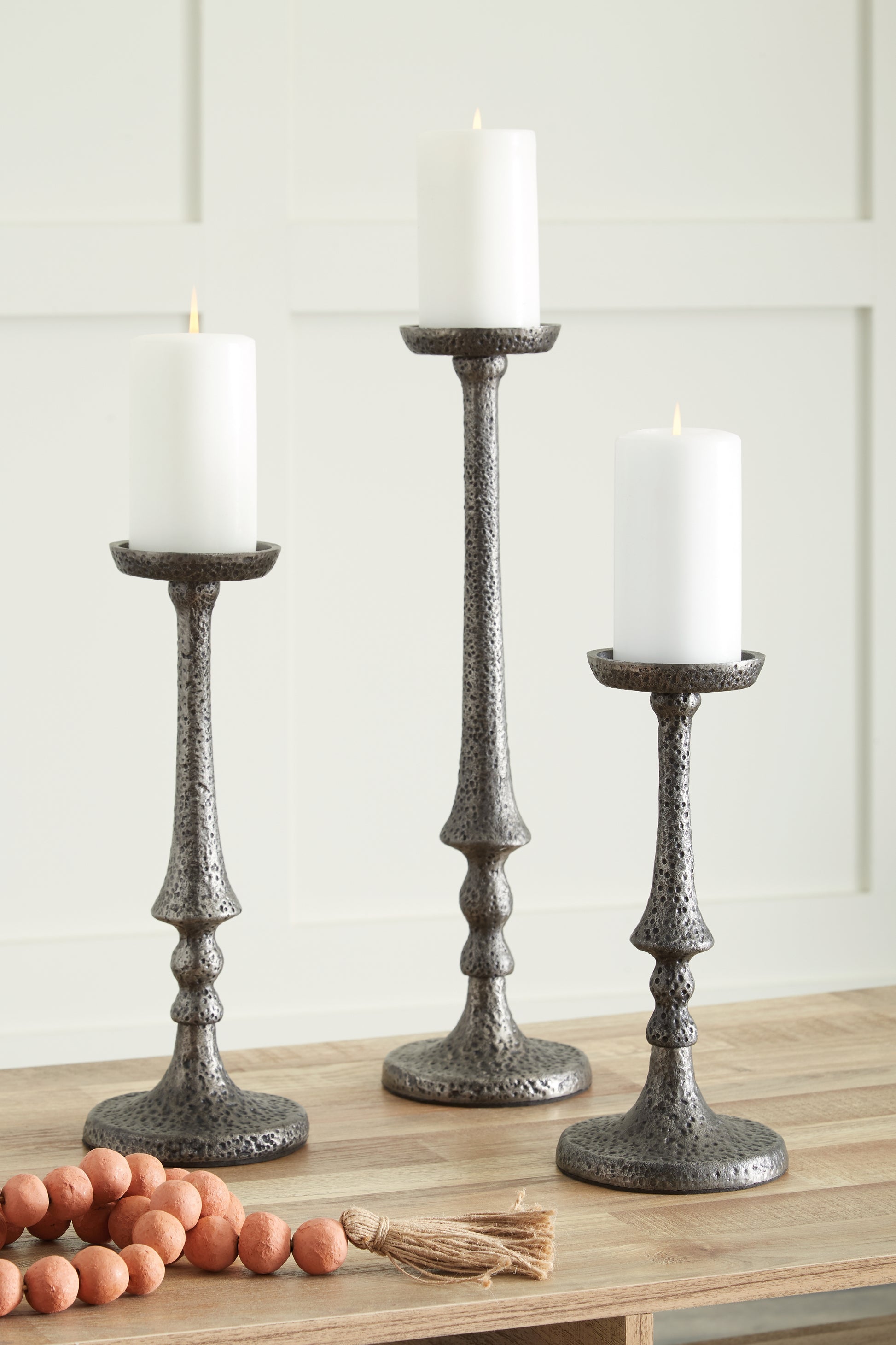 Is your ideal air of ambiance filled with antiqued flair? We invite you to tap into the plentiful possibilities of these candle holders. Scatter the set across shelves in your in-home library or office as a moody backdrop for your next illuminating idea. Or group them together on a living room coffee table—they’re an impactful industrial accent.