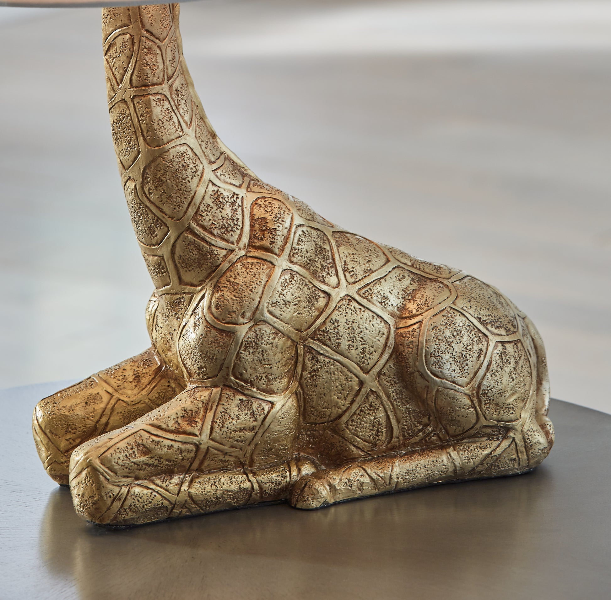 This giraffe lamp set combines contemporary style with eclectic charm. The curious animal peeks out over the top of the shade, adding a playful touch to the safari-inspired vibe. For glam appeal, a goldtone finish completes the look.