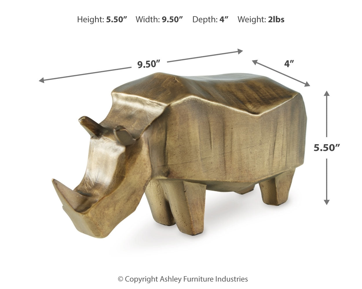 This rhino-shaped sculpture adds a touch of elegant adventure to your decor. Crafted with an antiqued goldtone finish, it’s well-suited for eclectic and contemporary spaces alike. Display it solo as a chic statement, or make it the focal point of a centerpiece arrangement.