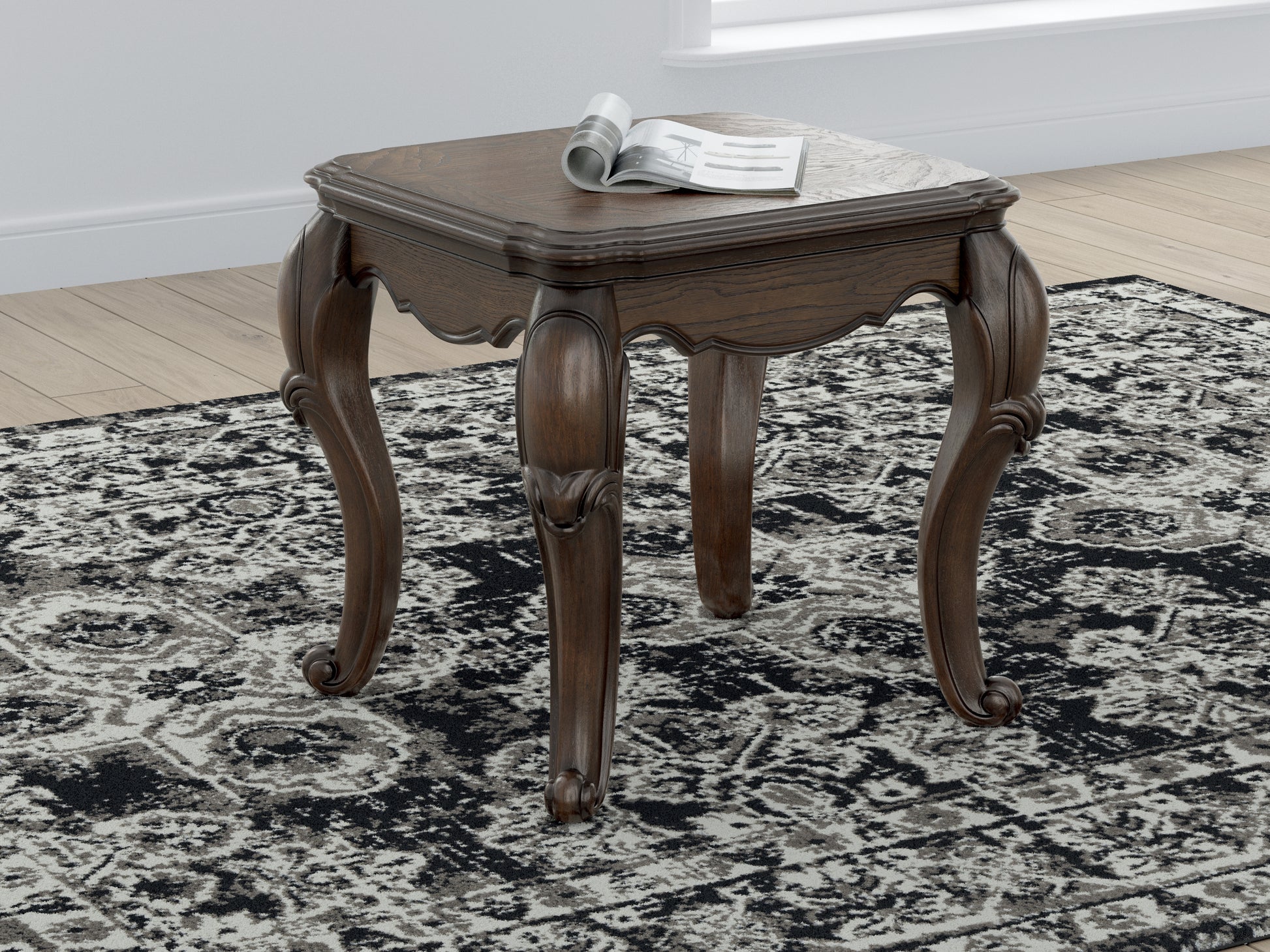 Lavish, luxurious living is within reach when you add this end table to your living room. Recalling a classic sense of refinement, its elegant scrolled legs make a beautifully bold statement. Ornate details on the apron add an air of opulence to the regal dark brown finish. The look is timeless. The feel? Right at home.