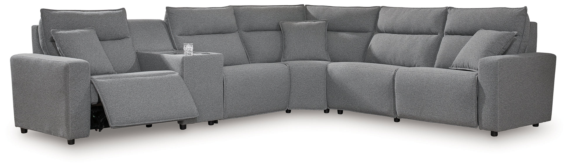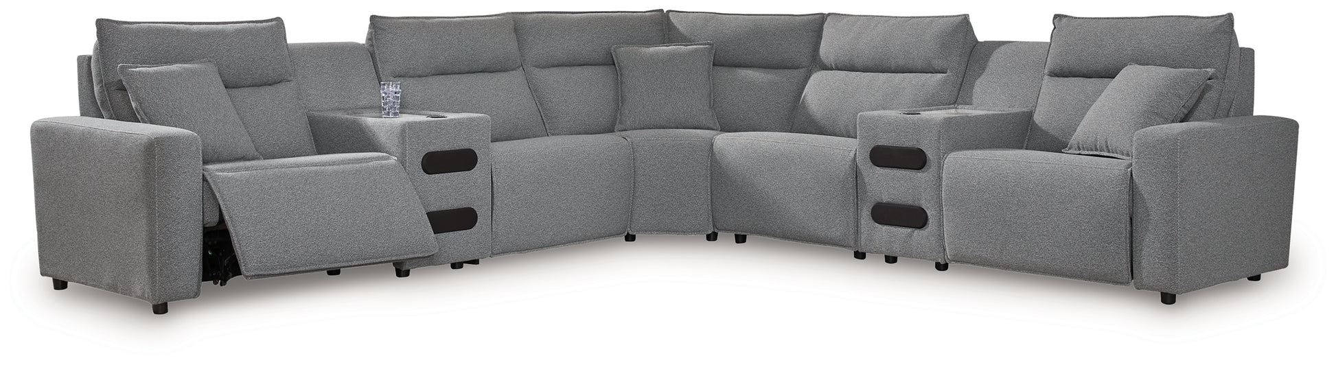 - Includes 6 modular pieces: left-arm facing power recliner, power armless recliner, armless chair, console, wedge and right-arm facing power chaise