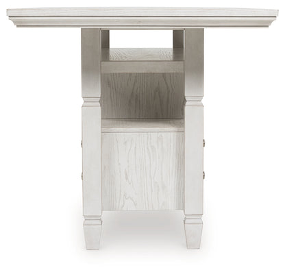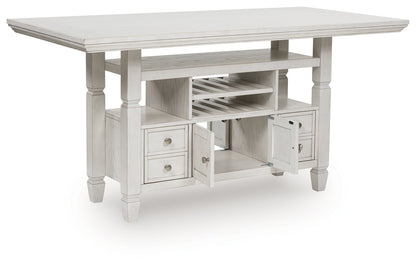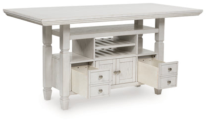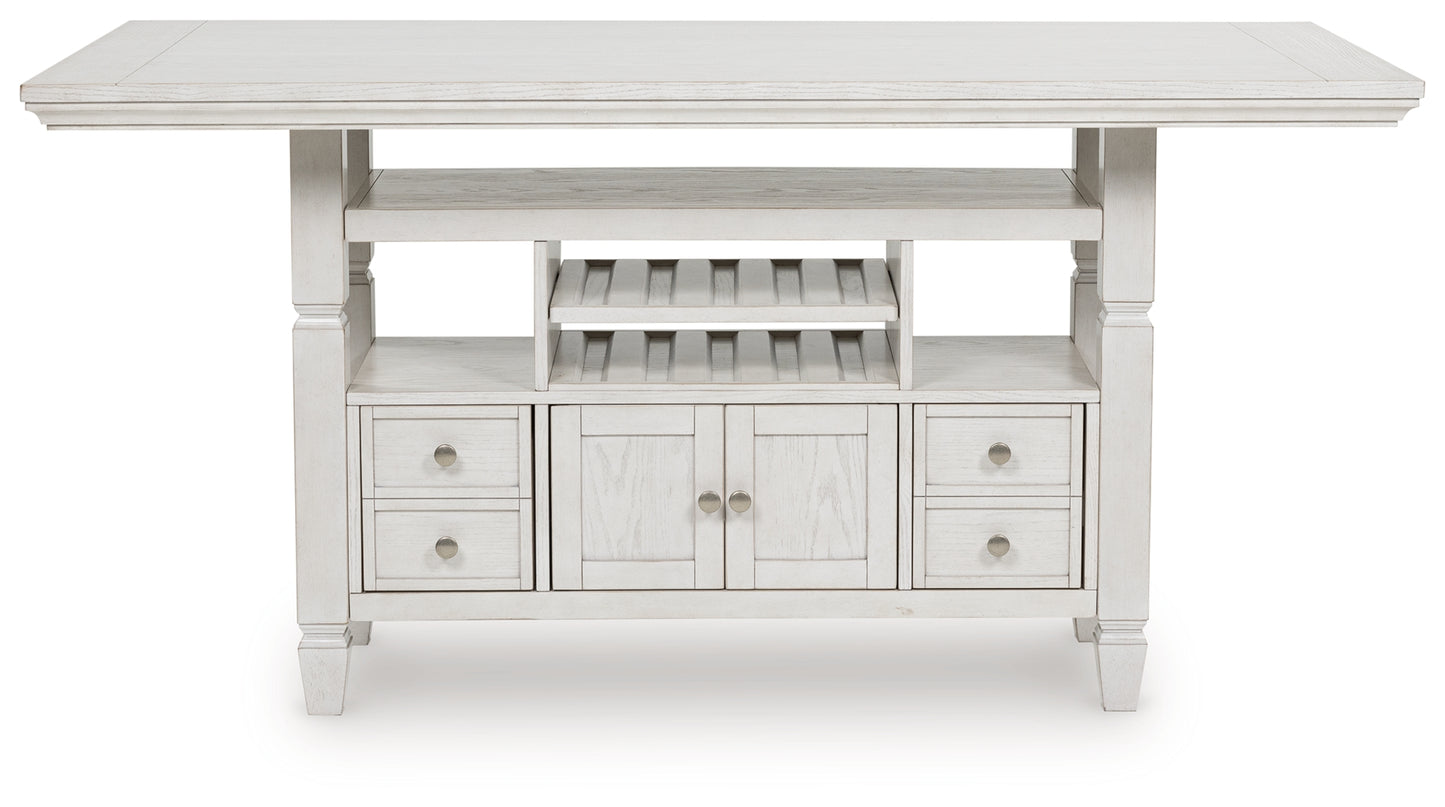 This counter height dining table brings an air of casual charm to mealtime. With its antiqued white finish, farmhouse-style dining has never been so fashionable. And this curated approach to everyday function is loaded with storage options, from cabinets to drawers to wine shelves. All that’s missing is you and your family.