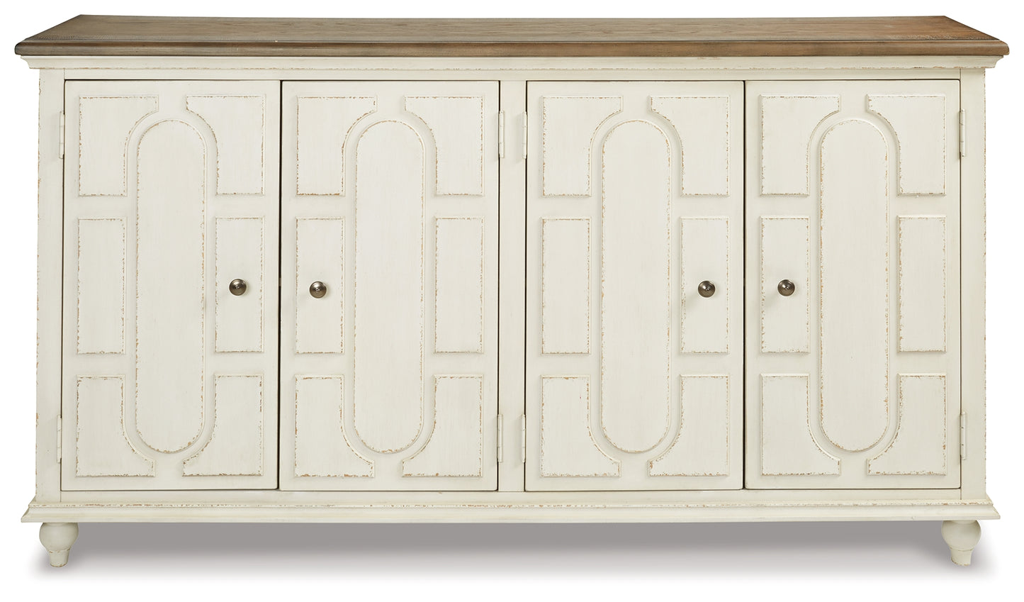 Whether your style is cottage chic, boho inspired or uniquely eclectic, this accent cabinet is sure to look right at home. Standout elements include raised panel door fronts that are a work of art. Wonderfully timeworn in antique white, this 4-door cabinet is topped with a warm brown finish for two-tone interest. Two adjustable shelves add to its practicality.