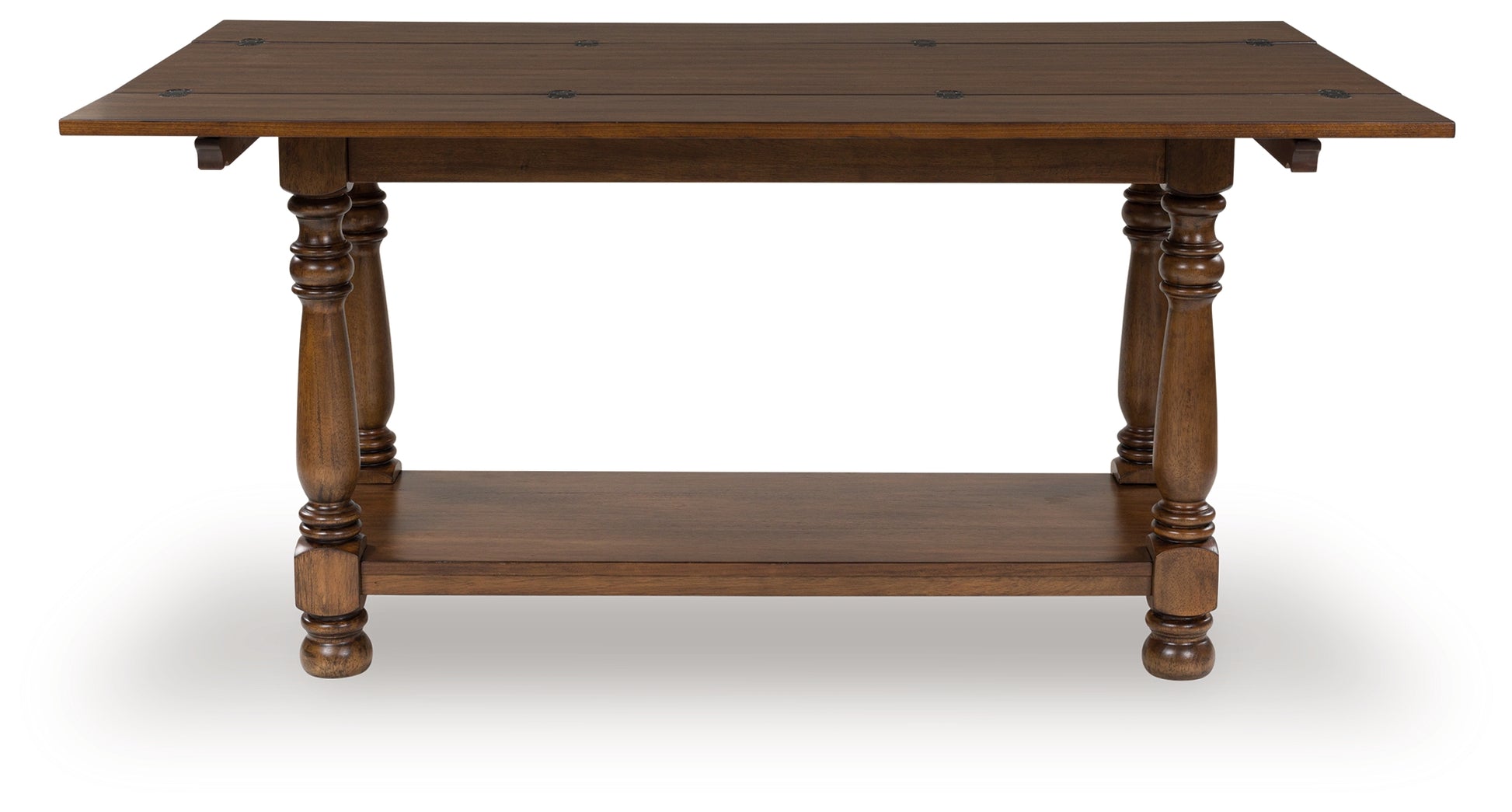 Traditional style doesn’t have to be stuffy. It can feel warm, inviting and beautifully in the moment. Case in point: this flip-top sofa table. Showcasing uniquely detailed leg posts, it has an allure all its own. Equally special is the rich brown finish, which exudes a mood of timeless charm. And when you need an extra dining space, simply fold open the table's hinged panels. How's that for relaxed refinement?
