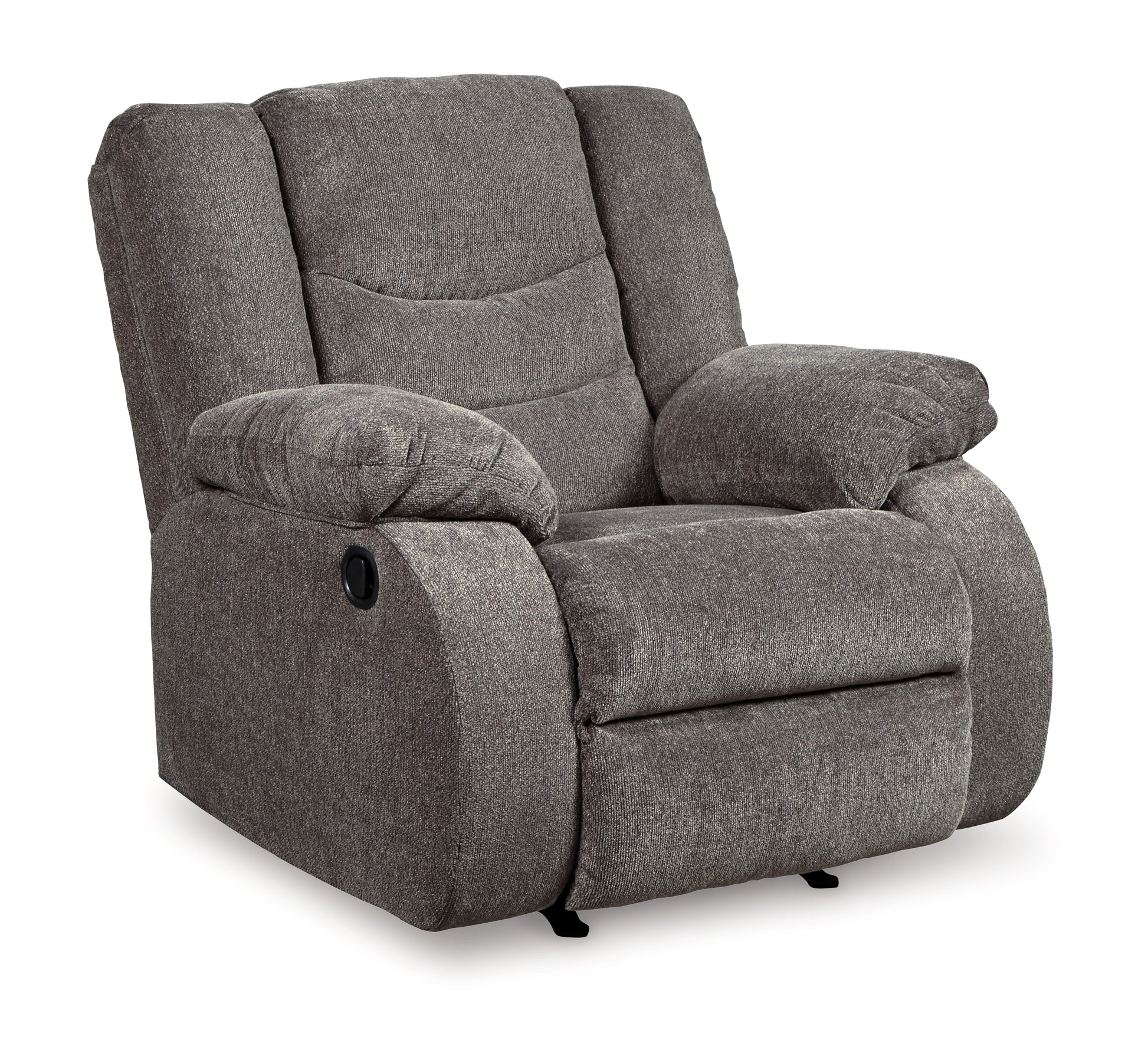 This rocker recliner puts the win in winning. Its waterfall back design and doubly plump pillow top arms team up with soft chenille fabric to go for the goal. Ample seating room makes the comfort possibilities endless. Sit back and relax. You won’t go wrong with this recliner.