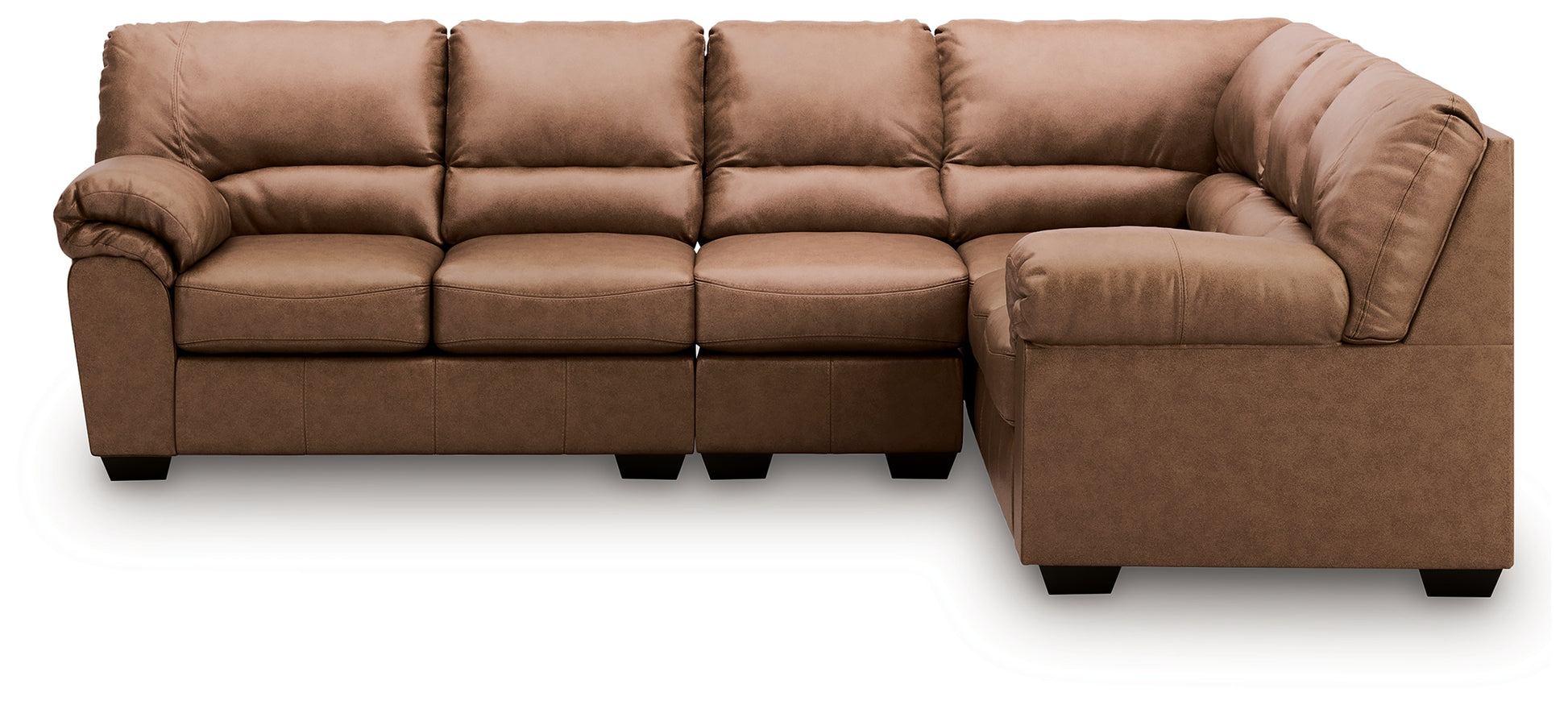 Modern comfort never looked so good. Sporting supremely soft yet durable cushions accented with high-fashion jumbo stitching, this stunning sectional is the ultimate choice in comfortably cool, contemporary style. Its caramel-hued faux leather indulges with an upscale feel and wows like the real thing.