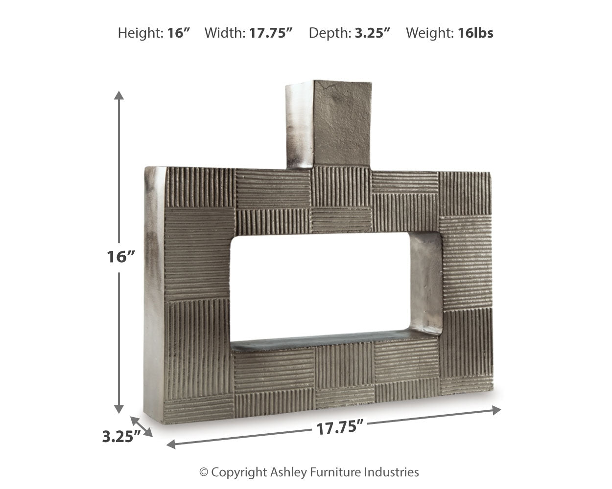 Stunning from all angles, this vase's contemporary geometric form acts as a captivating focal point for your mantle or bookshelf. Its antiqued nickel-tone body is detailed with subtle texture for added visual appeal. What a perfect fit for those seeking forward-thinking style.